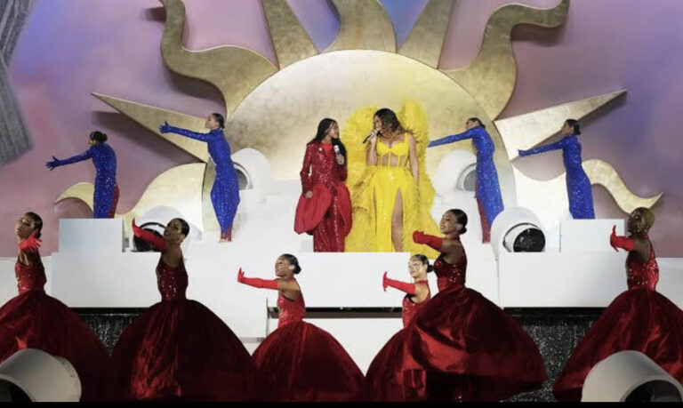 In the videos on social media, Beyoncé is dressed in a bright yellow gown with feathered details on her back, and Blue Ivy is in a sparkling red suit, surrounded by background dancers and vocalists in ballroom-style gowns in the same red hue. They’re standing against a background with a massive archway, under which is a stylized sun sculpture and lighting that resembles a stunning sunset. The singing was accompanied by an all-women orchestra of 48 people.