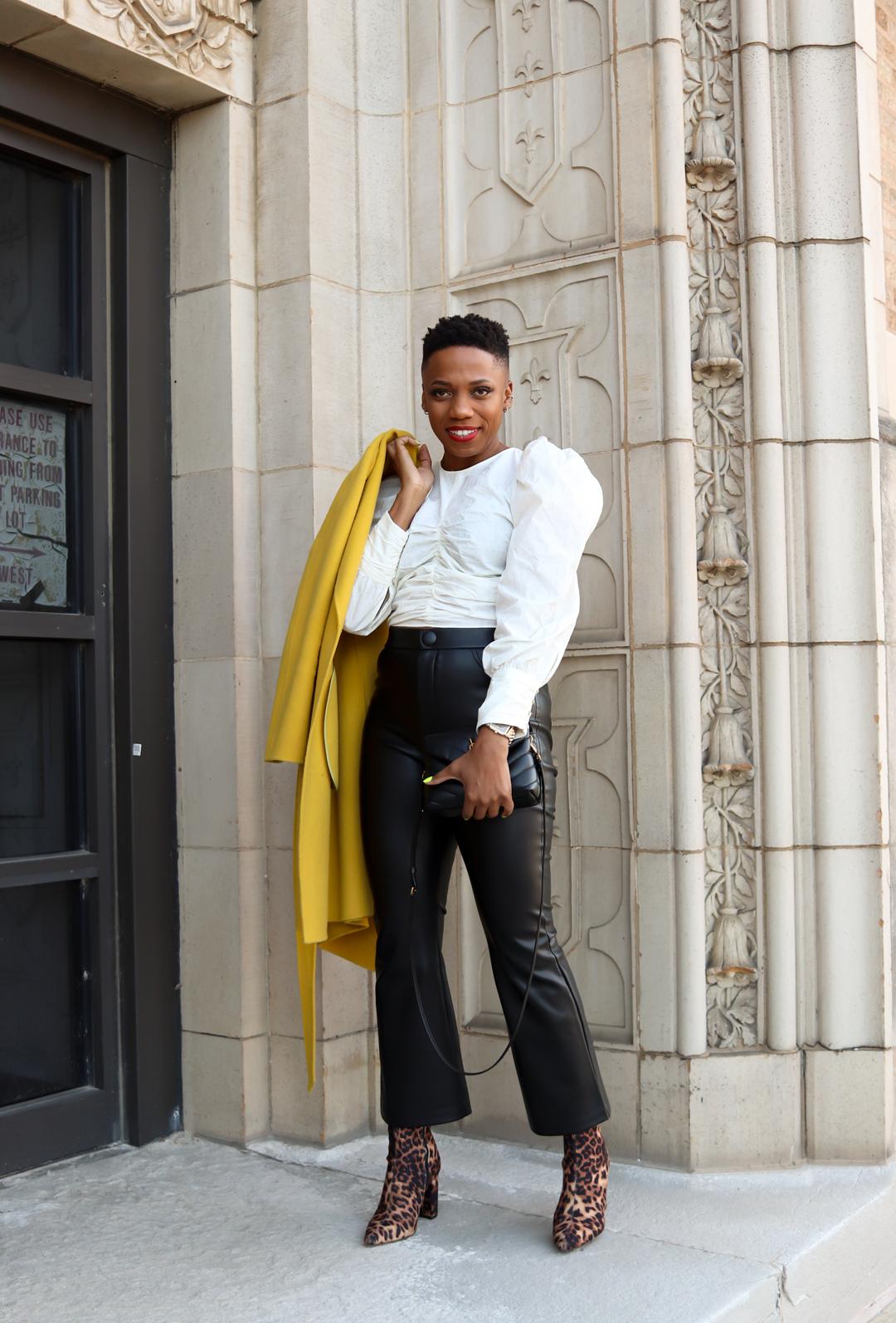 Some go-to options for styling leather are black leather pants paired with puff-sleeve blouse and ankle boots. A leather shirt can also be sported with tailored trousers.