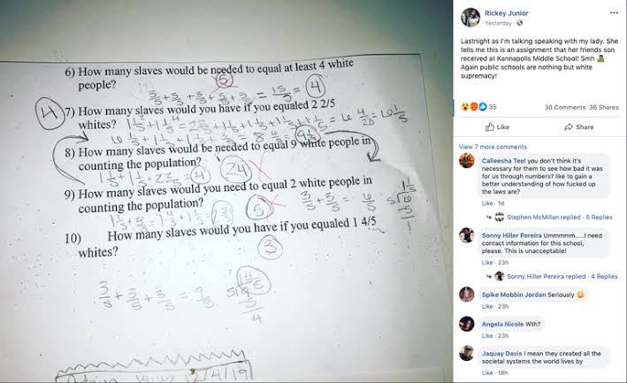 After working hours, to be able to send their child to get an education, any parent would be outraged by the disrespectful assignment that their child brought home. Of all things to ask a child, “How many slaves would be needed to equal at least 4 white people”? was the best a Kannapolis city School could come up with.