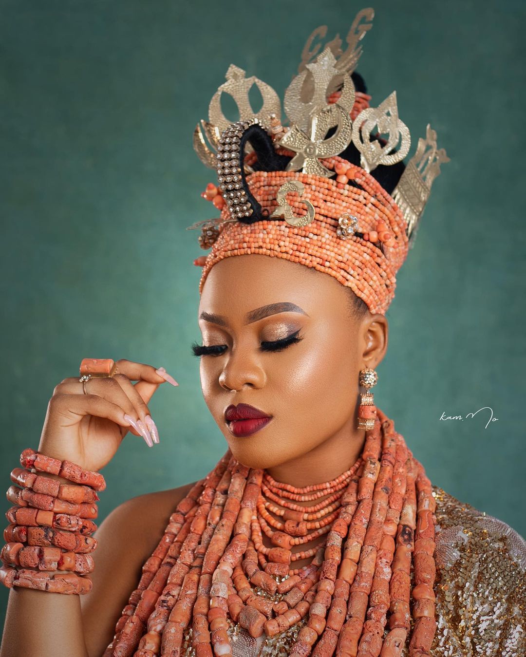 The Okuku hairstyle is a trademark of the Bini bridal look and on this shoot it was made by Casablanca Glam.