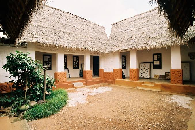 Arranged around courtyards, the buildings are constructed of timber, bamboo and mud plaster and originally had thatched roofs. The unique decorative bas-reliefs that adorn the walls are bold and depict a wide variety of motifs. Common forms include spiral and arabesque details with representations of animals, birds and plants, linked to traditional historical styles As with other traditional art forms of the Asante, these designs are not merely ornamental, they also have symbolic meanings, associated with the ideas and beliefs of the Asante people, and have been handed down from generation to generation.